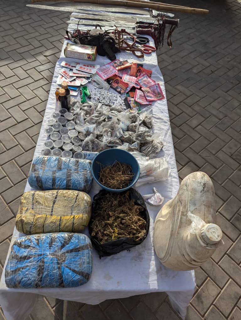 Other recovered items include 105 pieces of suspected exol tablets, five cutlasses, two scissors, two clubs and a bulk of suspected charms.